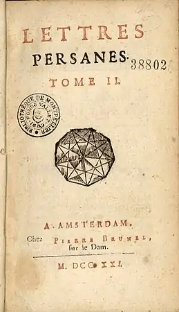 - Lettres persanes, t. 1, Cologne, Pierre Marteau, , 2e éd. (1re éd. 1721), 311 p. (disponible sur Internet Archive)