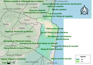 - l'« étang de Salses-Leucate » (4 964 ha), couvrant 6 communes dont 2 dans l'Aude et 4 dans les Pyrénées-Orientales[38] ;