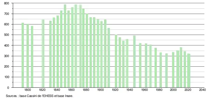 L'évolution du nombre d'habitants est connue à travers les recensements de la population effectués dans la commune depuis 1793. Pour les communes de moins de 10 000 habitants, une enquête de recensement portant sur toute la population est réalisée tous les cinq ans, les populations légales des années intermédiaires étant quant à elles estimées par interpolation ou extrapolation[17]. Pour la commune, le premier recensement exhaustif entrant dans le cadre du nouveau dispositif a été réalisé en 2005[18].