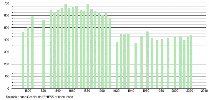 L'évolution du nombre d'habitants est connue à travers les recensements de la population effectués dans la commune depuis 1793. Pour les communes de moins de 10 000 habitants, une enquête de recensement portant sur toute la population est réalisée tous les cinq ans, les populations légales des années intermédiaires étant quant à elles estimées par interpolation ou extrapolation[20]. Pour la commune, le premier recensement exhaustif entrant dans le cadre du nouveau dispositif a été réalisé en 2007[21].