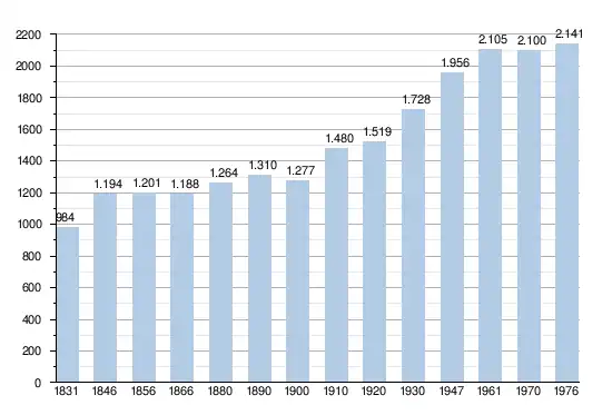 Graphe de l'évolution de la population de la commune. Les données ci-après intègrent les anciennes communes dans les données avant la fusion de 1971.