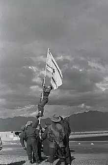 Le à 15h, les forces de la brigade HaNeguev parviennent au village de pêcheurs d'Umm Rashrash, à l'ouest d'Aqaba, dans la zone du site biblique d'Elath[1]. Sur ordre de leur commandant Nahum Sarig, un drapeau improvisé est fabriqué car les soldats n'en possèdent pas dans leur paquetage[3]. Celui-ci est constitué d'un drap blanc sur lequel est cousue une étoile de David récupérée sur une trousse de secours[3],[4]. Ses deux bandes sont tracées à l'encre. Ce drapeau de fortune est dressé devant le poste de police par Avraham Adan[5], futur général israélien, alors commandant de bataillon[4]. Les soldats de la Golani arrivent 2h plus tard[1] et remplacent le drapeau improvisé par un drapeau standard[6].