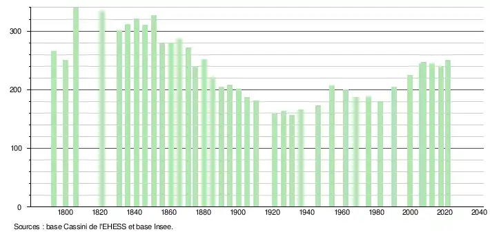 L'évolution du nombre d'habitants est connue à travers les recensements de la population effectués dans la commune depuis 1793. Pour les communes de moins de 10 000 habitants, une enquête de recensement portant sur toute la population est réalisée tous les cinq ans, les populations légales des années intermédiaires étant quant à elles estimées par interpolation ou extrapolation[17]. Pour la commune, le premier recensement exhaustif entrant dans le cadre du nouveau dispositif a été réalisé en 2007[18].