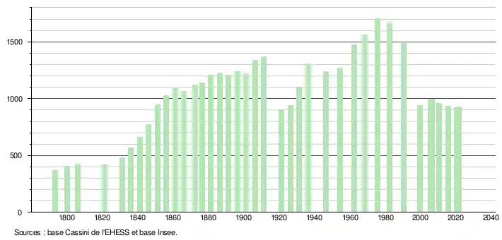 L'évolution du nombre d'habitants est connue à travers les recensements de la population effectués dans la commune depuis 1793. Pour les communes de moins de 10 000 habitants, une enquête de recensement portant sur toute la population est réalisée tous les cinq ans, les populations légales des années intermédiaires étant quant à elles estimées par interpolation ou extrapolation[34]. Pour la commune, le premier recensement exhaustif entrant dans le cadre du nouveau dispositif a été réalisé en 2005[35].