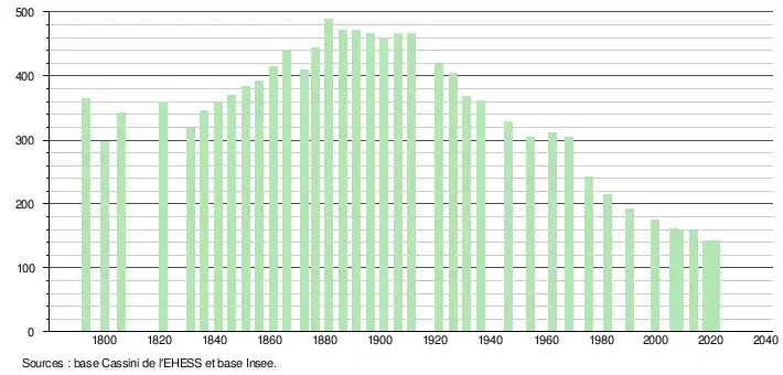 L'évolution du nombre d'habitants est connue à travers les recensements de la population effectués dans la commune depuis 1793. Pour les communes de moins de 10 000 habitants, une enquête de recensement portant sur toute la population est réalisée tous les cinq ans, les populations légales des années intermédiaires étant quant à elles estimées par interpolation ou extrapolation[19]. Pour la commune, le premier recensement exhaustif entrant dans le cadre du nouveau dispositif a été réalisé en 2008[20].