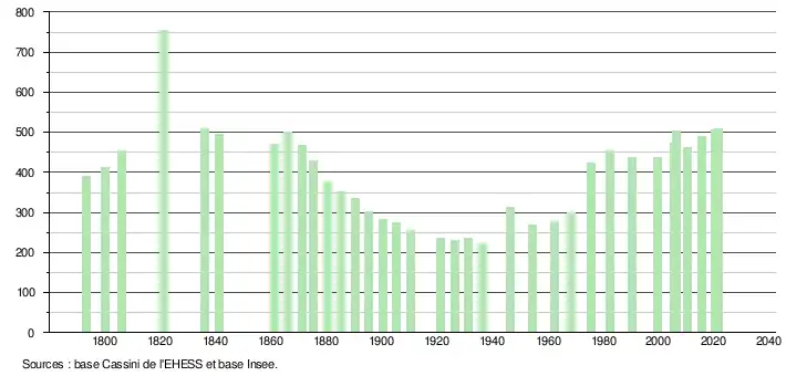 L'évolution du nombre d'habitants est connue à travers les recensements de la population effectués dans la commune depuis 1793. Pour les communes de moins de 10 000 habitants, une enquête de recensement portant sur toute la population est réalisée tous les cinq ans, les populations légales des années intermédiaires étant quant à elles estimées par interpolation ou extrapolation[16]. Pour la commune, le premier recensement exhaustif entrant dans le cadre du nouveau dispositif a été réalisé en 2005[17].