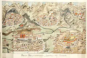 En 1720, l'empereur mandchou Kangxi, allié aux Mongols Khalkhas, lance son armée sur Lhassa pour en chasser les Mongols dzoungars. À l'automne 1720, les murailles de Lhassa sont abattues et 2 000 soldats mongols y sont laissés en garnison[11].
