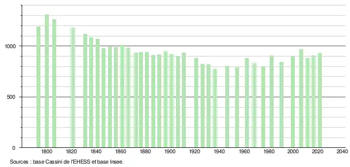 L'évolution du nombre d'habitants est connue à travers les recensements de la population effectués dans la commune depuis 1793. Pour les communes de moins de 10 000 habitants, une enquête de recensement portant sur toute la population est réalisée tous les cinq ans, les populations légales des années intermédiaires étant quant à elles estimées par interpolation ou extrapolation[18]. Pour la commune, le premier recensement exhaustif entrant dans le cadre du nouveau dispositif a été réalisé en 2006[19].