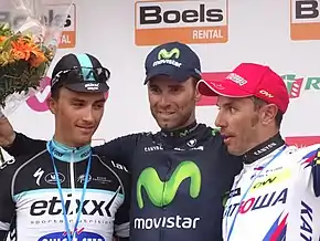 | Julian Alaphilippe ({{2e}}), Alejandro Valverde ({{1er}}) et Joaquim Rodríguez ({{3e}}). | |||