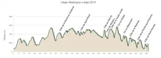 Liège-Bastogne-Liège est la dernière des trois classiques ardennaises et est la course de clôture de la saison de printemps des classiques. Les classiques ardennaises sont trois courses avec de nombreuses côtes escarpées et courtes[7]. Le tracé emmène les coureurs dès le départ à Liège au sud de Bastogne. Après 107 kilomètres, le parcours se tourne vers le nord, pour revenir à Liège. La deuxième partie de course est plus longue (146 kilomètres) et entraîne les coureurs au nord-est de Spa avant de tourner à l'ouest jusqu'à l'arrivée. La course se termine à Ans, juste à l'ouest de Liège.