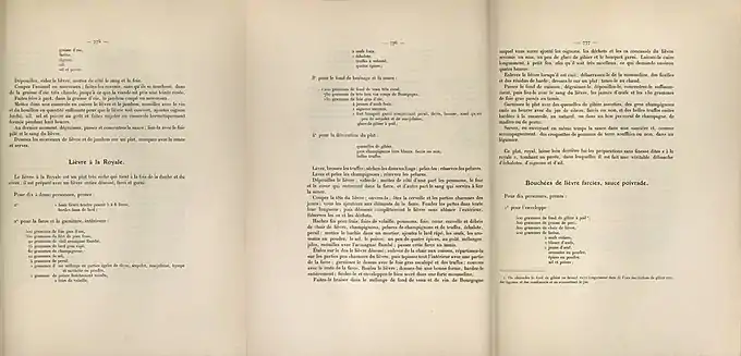 - L'auteur introduit sa recette de Lièvre à la Royale en ces termes : « Le lièvre à la Royale est un plat très riche qui tient à la fois de la daube et du civet ; il est préparé avec un lièvre entier désossé, farci et garni. » Puis, en fin de recette, il adresse à demi-mot une critique à la recette compotée du sénateur Couteaux : « Ce plat, royal, laisse loin derrière lui les préparations sans finesse dites « à la royale », tombant en purée, dans lesquelles il est fait une véritable débauche d'échalotes, d'oignons et d'ail. »[11].