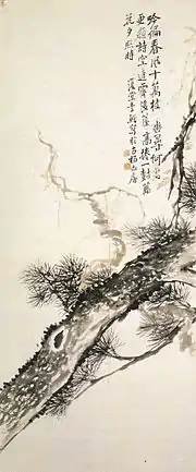 Pin et glucine représente un vieux pin à l'écorce rugueuse et au feuillage dense. L'arbre occupe la diagonale, tandis que la glycine grimpe en s'enroulant autour du tronc. C'est un rouleau mural peint à l'encre, avec juste une légère nuance de couleur. Comme dans la plupart de ses œuvres, peinture, calligraphie et poésie se combinent pour former un tout indissociable. Le poème, inscrit sur le côté supérieur droit de la peinture, dit :