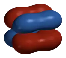 En chimie, une liaison δ (prononcé delta) est une liaison chimique covalente dans laquelle quatre lobes d'une orbitale atomique occupée par un électron unique se recouvrent avec quatre lobes d'une orbitale occupée par un électron d'un autre atome. Il existe exactement deux plans nodaux entre les deux atomes liés passant par l'axe internucléaire[1],[2],[3],[4].