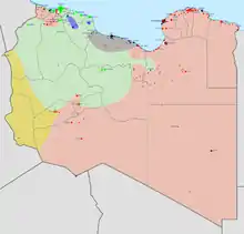 En 2014-2015, la Libye est également confrontée à l'implantation sur son sol de l'État islamique, notamment à Misrata[93], à Sabratha[94] et à Syrte[95].
