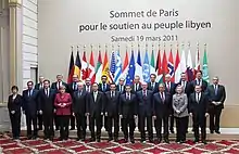 Le , en accord avec la résolution 1973 du Conseil de sécurité des Nations unies, une intervention militaire aéronavale est déclenchée par la France avec l'opération Harmattan, suivie par le Royaume-Uni et les États-Unis, appuyées par l'Italie, afin d'établir une zone d'exclusion aérienne et de protéger les populations civiles contre les bombardements[64]. Plusieurs navires de guerre ainsi que des avions de chasse sont mobilisés pour détruire les défenses anti-aériennes des forces loyales au colonel Kadhafi afin d'empêcher que les insurgés et les forces de la coalition ne subissent des attaques[65]. Les attaques de la coalition ont débuté alors que les forces de l'armée libyenne investissaient les faubourgs de Benghazi et s'apprêtaient à investir le centre-ville. L'invasion de Benghazi est empêchée.