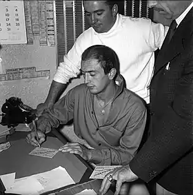 Pierre Lacaze signant au Toulouse Olympique sa licence de Rugby à XIII auprès de la Ligue Française de Rugby en 1959.