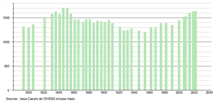L'évolution du nombre d'habitants est connue à travers les recensements de la population effectués dans la commune depuis 1793. Pour les communes de moins de 10 000 habitants, une enquête de recensement portant sur toute la population est réalisée tous les cinq ans, les populations légales des années intermédiaires étant quant à elles estimées par interpolation ou extrapolation[46]. Pour la commune, le premier recensement exhaustif entrant dans le cadre du nouveau dispositif a été réalisé en 2008[47].