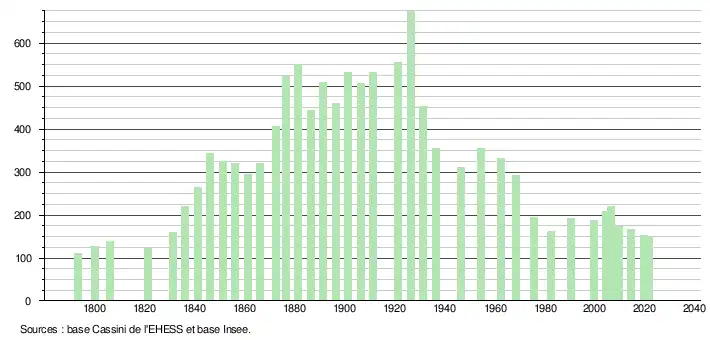 L'évolution du nombre d'habitants est connue à travers les recensements de la population effectués dans la commune depuis 1793. Pour les communes de moins de 10 000 habitants, une enquête de recensement portant sur toute la population est réalisée tous les cinq ans, les populations légales des années intermédiaires étant quant à elles estimées par interpolation ou extrapolation[18]. Pour la commune, le premier recensement exhaustif entrant dans le cadre du nouveau dispositif a été réalisé en 2004[19].