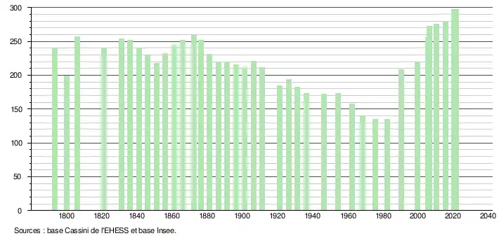 L'évolution du nombre d'habitants est connue à travers les recensements de la population effectués dans la commune depuis 1793. Pour les communes de moins de 10 000 habitants, une enquête de recensement portant sur toute la population est réalisée tous les cinq ans, les populations légales des années intermédiaires étant quant à elles estimées par interpolation ou extrapolation[25]. Pour la commune, le premier recensement exhaustif entrant dans le cadre du nouveau dispositif a été réalisé en 2005[26].