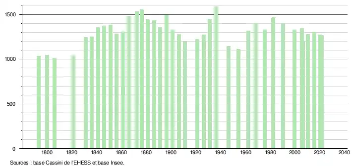 L'évolution du nombre d'habitants est connue à travers les recensements de la population effectués dans la commune depuis 1793. Pour les communes de moins de 10 000 habitants, une enquête de recensement portant sur toute la population est réalisée tous les cinq ans, les populations légales des années intermédiaires étant quant à elles estimées par interpolation ou extrapolation[20]. Pour la commune, le premier recensement exhaustif entrant dans le cadre du nouveau dispositif a été réalisé en 2005[21].
