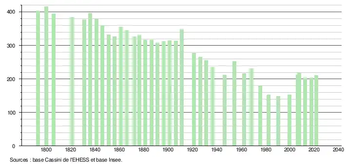 L'évolution du nombre d'habitants est connue à travers les recensements de la population effectués dans la commune depuis 1793. Pour les communes de moins de 10 000 habitants, une enquête de recensement portant sur toute la population est réalisée tous les cinq ans, les populations légales des années intermédiaires étant quant à elles estimées par interpolation ou extrapolation[18]. Pour la commune, le premier recensement exhaustif entrant dans le cadre du nouveau dispositif a été réalisé en 2007[19].