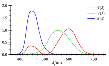 où M(λ,T) est l'exitance de l'émission lumineuse d'un corps noir de température T pour la longueur d'onde λ ; et X(λ), Y(λ) et Z(λ) sont les fonctions colorimétriques (représentées sur le diagramme ci-contre) représentant la sensibilité suivant chacun de ses trois récepteurs de l'observateur de référence en fonction de la longueur d'onde λ.