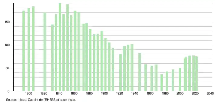 L'évolution du nombre d'habitants est connue à travers les recensements de la population effectués dans la commune depuis 1793. Pour les communes de moins de 10 000 habitants, une enquête de recensement portant sur toute la population est réalisée tous les cinq ans, les populations légales des années intermédiaires étant quant à elles estimées par interpolation ou extrapolation[23]. Pour la commune, le premier recensement exhaustif entrant dans le cadre du nouveau dispositif a été réalisé en 2007[24].