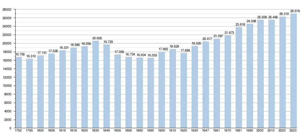 - Source : DGS - Remarque: 1806 jusqu'à 1981=recensement; depuis 1990=nombre d'habitants chaque 1er janvier[10]