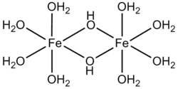 {(Fe(III)(OH2)4)2(µ-OH)2}4+ | Dans cet exemple l'hydroxyde joue le rôle d'un ligand pontant μ2. |