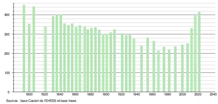 L'évolution du nombre d'habitants est connue à travers les recensements de la population effectués dans la commune depuis 1793. Pour les communes de moins de 10 000 habitants, une enquête de recensement portant sur toute la population est réalisée tous les cinq ans, les populations légales des années intermédiaires étant quant à elles estimées par interpolation ou extrapolation[29]. Pour la commune, le premier recensement exhaustif entrant dans le cadre du nouveau dispositif a été réalisé en 2006[30].