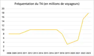 En , le bilan de la première décennie de fonctionnement du T4 est jugé « catastrophique » par le nouveau directeur des lignes E, P et T4, avec une dégradation progressive de sa régularité qui a chuté de 20 points en 5 ans pour tomber fin 2016 à 74,5 %[17]. Les conducteurs se plaignent de fonctionner en service dégradé avec une fréquence réelle de passage de 9 à 18 minutes, au lieu de 6 en nominal, ce qui génère une relation difficile avec les voyageurs. La mise en service d'un nouvel atelier commun avec celui du T11 a permis d'améliorer la maintenance et de réparer une rame en panne pendant trois ans. La direction de ligne annonce la mise en place d'écrans d’information sur les bus de remplacement dès et une refonte de la signalisation sur tout le parcours en 2019 avec priorité aux feux[17].