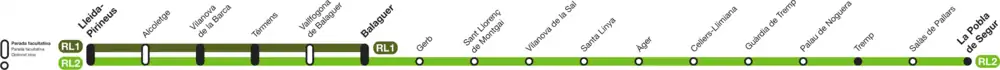 Le 13 janvier 2018, les services entre Lérida et Balaguer ont été baptisés RL1, tandis que ceux qui vont jusqu'à La Pobla de Segur sont nommés RL2. Le même jour, 5 gares sont devenues des arrêts facultatifs[22].