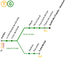 Dès 2009, alors que la ligne T1 est en construction, un prolongement de celle-ci est envisagée : c'est le projet de ligne Garonne, également connue sous le nom de ligne G. Après plusieurs débats et réunions publiques, le prolongement initialement prévu fin 2013, puis au deuxième trimestre 2014[18] doit être mis en essai en et en service en . Elle prolongera la ligne T1 en reliant la station des Arènes à la station Palais-de-Justice en passant la Garonne sur le pont Saint-Michel. Ce sera ainsi le premier maillon d'un tramway traversant Toulouse. Effectivement, le tracé choisit permet une extension ultérieure vers le sud-est toulousain (Labège ou Saint-Orens-de-Gameville, via Rangueil et Montaudran)[19]. C'est le grand projet des transports en commun de Toulouse.