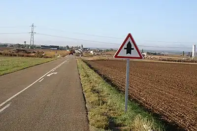 Ligne d’annonce de ligne continue sur une route de campagne française, et panneau de priorité ponctuelle de type AB2 au premier plan
