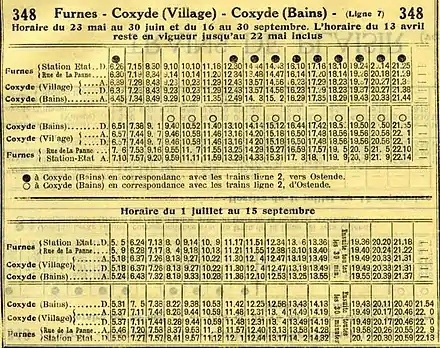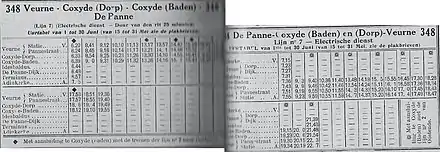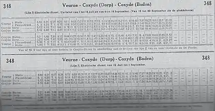 Tableaux[note 1] : 348 (1931)[5], n° de tableau partagé par les lignes 7 Furnes - Coxyde, 9 Furnes - Ostdunkerque, 21 Adinkerque - La Panne et 348 Ostende - Furnes.