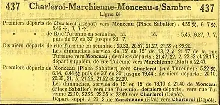 - : 437, numéro partagé avec les lignes 74 Charleroi - Montigny-le-Tilleul et 437B Charleroi - Thuillies ;