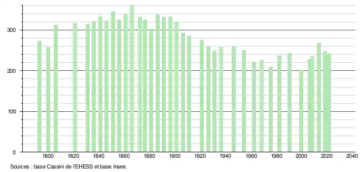 L'évolution du nombre d'habitants est connue à travers les recensements de la population effectués dans la commune depuis 1793. Pour les communes de moins de 10 000 habitants, une enquête de recensement portant sur toute la population est réalisée tous les cinq ans, les populations légales des années intermédiaires étant quant à elles estimées par interpolation ou extrapolation[32]. Pour la commune, le premier recensement exhaustif entrant dans le cadre du nouveau dispositif a été réalisé en 2008[33].