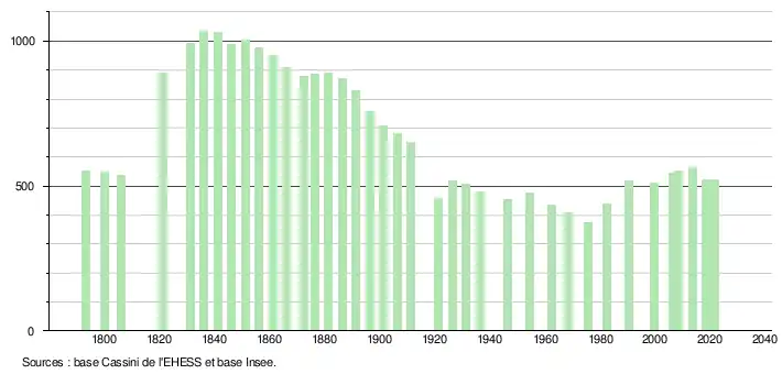 L'évolution du nombre d'habitants est connue à travers les recensements de la population effectués dans la commune depuis 1793. Pour les communes de moins de 10 000 habitants, une enquête de recensement portant sur toute la population est réalisée tous les cinq ans, les populations légales des années intermédiaires étant quant à elles estimées par interpolation ou extrapolation[23]. Pour la commune, le premier recensement exhaustif entrant dans le cadre du nouveau dispositif a été réalisé en 2008[24].