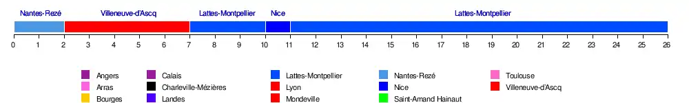 | Lattes-Montpellier | 6 | 8 | 5 | 3 | 3 | 3 | 3 | 1 | 1 | 1 | 2-1 | 1-1 | 1-1 | 1-1 | 1-1 | 1 | 1 | 1 | 1 | 1 | 1 | 1 | 1 | 1 | 1 | 1 | 18 | |