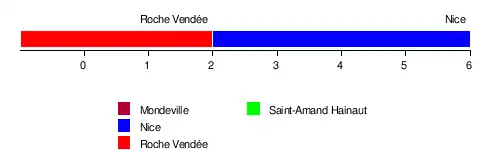 | Nantes-Rezé | Non disputé | 4e du groupe J | 2-4 (33 %) | Éliminée | 2-4 (33 %) | |
