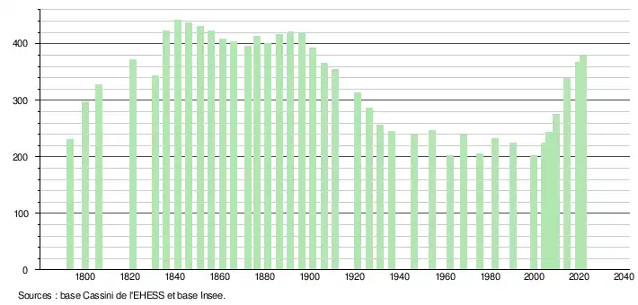 L'évolution du nombre d'habitants est connue à travers les recensements de la population effectués dans la commune depuis 1793. Pour les communes de moins de 10 000 habitants, une enquête de recensement portant sur toute la population est réalisée tous les cinq ans, les populations légales des années intermédiaires étant quant à elles estimées par interpolation ou extrapolation[19]. Pour la commune, le premier recensement exhaustif entrant dans le cadre du nouveau dispositif a été réalisé en 2004[20].