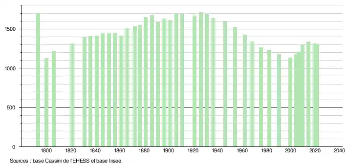 L'évolution du nombre d'habitants est connue à travers les recensements de la population effectués dans la commune depuis 1793. Pour les communes de moins de 10 000 habitants, une enquête de recensement portant sur toute la population est réalisée tous les cinq ans, les populations légales des années intermédiaires étant quant à elles estimées par interpolation ou extrapolation[20]. Pour la commune, le premier recensement exhaustif entrant dans le cadre du nouveau dispositif a été réalisé en 2004[21].