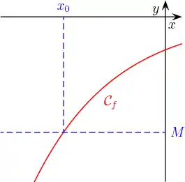 Il se peut aussi qu'au point la fonction n'ait pas de limite finie mais une limite infinie : à mesure que l'on se rapproche de la valeur de devient de plus en plus « proche » de (respectivement ), c'est-à-dire de plus en plus grande (resp. plus grande en valeur absolue mais avec un signe négatif). La formulation mathématique est alors la suivante : pour tout « seuil de tolérance » on peut trouver un « écart de confiance » tel que, dès que (appartenant à ) est proche de à près, alors est plus grande (resp. plus petite) que :