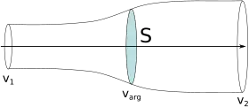 - remarque : Le capteur éolien capte l'énergie cinétique du vent, cela réduit v, la vitesse du vent et donc parallèlement s augmente de la même proportion, d'où la figure ci-dessous représentant le tube de courant (bleu) dans lequel est plongé le capteur éolien.