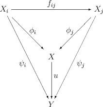 soit commutatif pour tous i ≤ j. La limite inductive est notée : . On parlera de limite inductive des Xi suivant les morphismes de transition fij, ou par abus de langage, de limite suivant I, voir tout simplement de limite inductive des Xi.