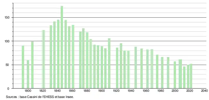 L'évolution du nombre d'habitants est connue à travers les recensements de la population effectués dans la commune depuis 1793. Pour les communes de moins de 10 000 habitants, une enquête de recensement portant sur toute la population est réalisée tous les cinq ans, les populations légales des années intermédiaires étant quant à elles estimées par interpolation ou extrapolation[16]. Pour la commune, le premier recensement exhaustif entrant dans le cadre du nouveau dispositif a été réalisé en 2007[17].