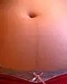 Cicatrice d'une césarienne (ligne horizontale rouge) et Linea nigra chez une femme de trente-et-un ans, sept semaines après l’accouchement.
