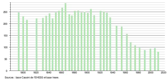 L'évolution du nombre d'habitants est connue à travers les recensements de la population effectués dans la commune depuis 1793. À partir du , les populations légales des communes sont publiées annuellement dans le cadre d'un recensement qui repose désormais sur une collecte d'information annuelle, concernant successivement tous les territoires communaux au cours d'une période de cinq ans. Pour les communes de moins de 10 000 habitants, une enquête de recensement portant sur toute la population est réalisée tous les cinq ans, les populations légales des années intermédiaires étant quant à elles estimées par interpolation ou extrapolation[24]. Pour la commune, le premier recensement exhaustif entrant dans le cadre du nouveau dispositif a été réalisé en 2006[25],[Note 1].