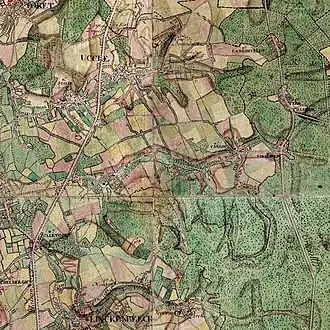 Le lieu où se trouve la place communale actuelle, s'appelait à l'origine "Oplinkebeek"[5] par opposition au noyau primitif du village qui se trouvait plus bas. Le centre s'est déplacé après la construction de l'Église[5] mais cette différence se trouvait encore sur certain plan du XIXe siècle.
