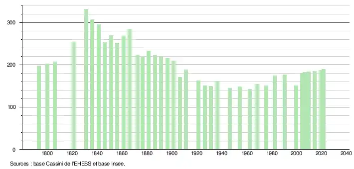 L'évolution du nombre d'habitants est connue à travers les recensements de la population effectués dans la commune depuis 1793. Pour les communes de moins de 10 000 habitants, une enquête de recensement portant sur toute la population est réalisée tous les cinq ans, les populations légales des années intermédiaires étant quant à elles estimées par interpolation ou extrapolation[19]. Pour la commune, le premier recensement exhaustif entrant dans le cadre du nouveau dispositif a été réalisé en 2004[20].
